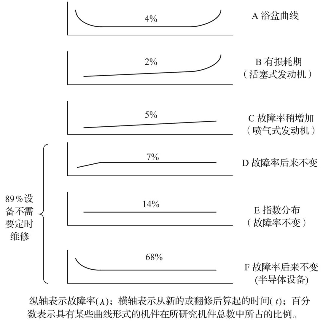 通过美国航空航天局(NASA)统计数据表明,航空设备故障率大致可以分为六种类型,其故障率曲线 六种基本故障率(λ)与时间(t)的关系曲线中的六种故障率曲线,可以看到,A型为经典的浴盆曲线,有明显的耗损期;B型故障率具有常数或渐升的特征,然后出现明显的耗损期,符合这两种形式的是各种零件或简单产品的故障,如轮胎、刹车片、活塞式发动机的汽缸的故障,它们通常具有机械磨损、材料老化、金属疲劳等;C型没有明显的耗损期,但是故障率也是随着使用时间的增加而增加的;曲线D显示了新设备从刚出厂的低故障率,急剧地增长到一个恒定的故障率;曲线E显示设备的故障为恒定值,出现的故障常常是偶然因素造成的;而曲线F显示设备开始有高的初期故障率,然后急剧下降到一个恒定的或者是增长极为缓慢的故障率。